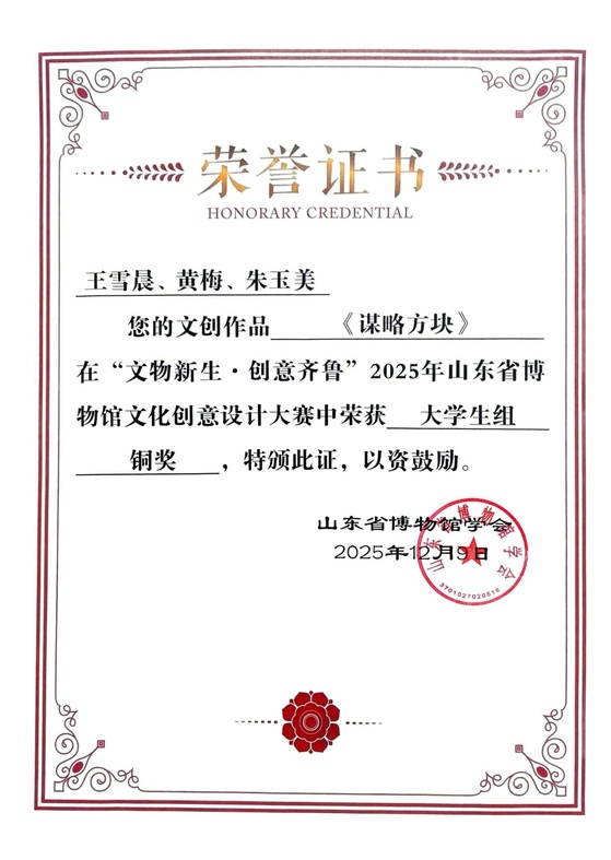 自本次大赛启动以来,学院高度重视、系统部署,积极整合校内外资源,围绕大赛主题开展多轮专项辅导与创作研讨,广泛动员师生参与文化创意实践。学院邀请滨州市博物馆领导、专家到校内对我院作品进行校级初赛评选,参赛同学们积极论证自己的作品,最终评选出我院12件作品提交省赛。在省赛阶段,人文学子们展现出良好的综合素质与创新能力。其中,研究生王雪晨、黄梅、朱玉美团队的作品《谋略方块》荣获大学生组铜奖,体现了我院在文化传承与创意人才培养方面的扎实成果。