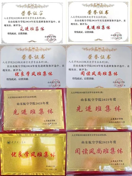 1.人文学院22中文本2、22历史本2荣获山东航空学院2024年度先进班集体称号,23中文本1荣获山东航空学院2024年度优良学风班集体称号,23历史本2荣获山东航空学院2024年度阅读风尚班集体称号,23历史本2、24历史本1荣获山东航空学院2025年度先进班集体称号,24中文本2荣获山东航空学院2025年度优良学风班集体称号,23中文本2荣获山东航空学院2025年度阅读风尚班集体称号
