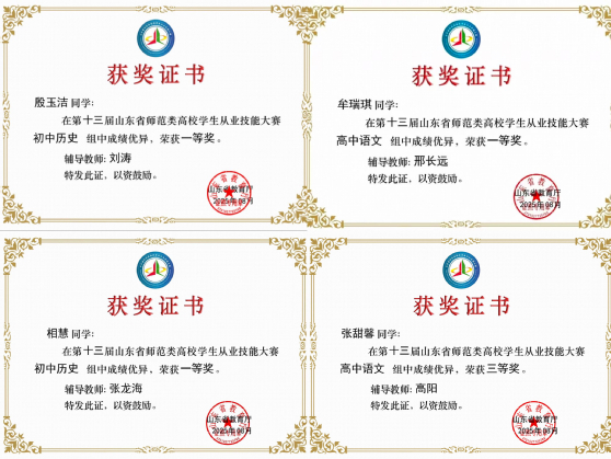 1.第十三届山东省师范类高校学生从业技能大赛一等奖3项、三等奖2项