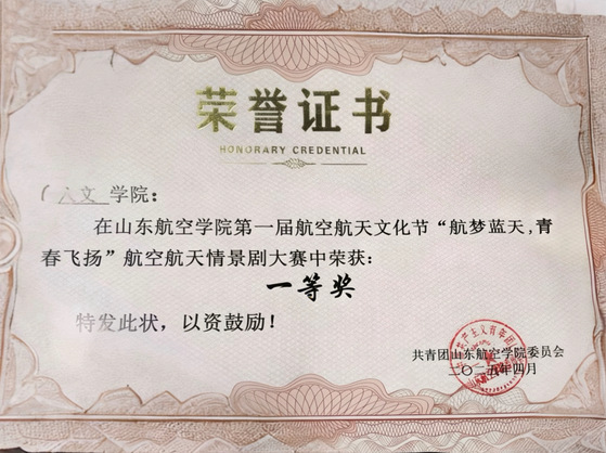 1.山东航空学院第一届航空航天文化节“航梦蓝天,青春飞扬”航空航天情景剧大赛一等奖1项