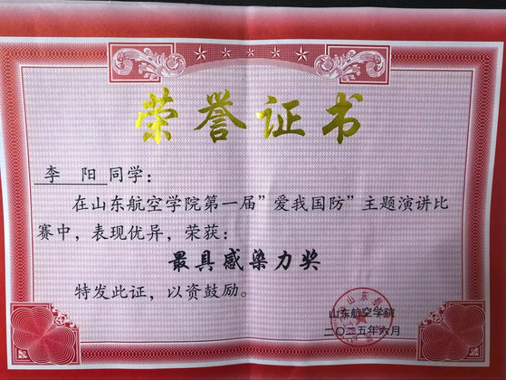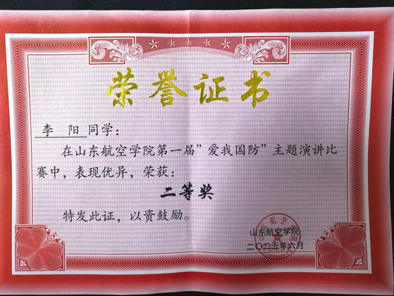5.山东航空学院第一届“爱我国防”主题演讲比赛二等奖1项、最具感染力奖1项