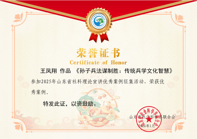 2016年1月,在山东省社会科学界联合会组织开展的2025年山东省社科理论宣讲优秀案例征集活动中,我院王凤翔教授申报的作品《孙子兵法谋制胜:传统兵学智慧》荣获优秀案例。该案例被收入《山东省“社科专家走基层”案例选编》,由新华出版社出版发行。